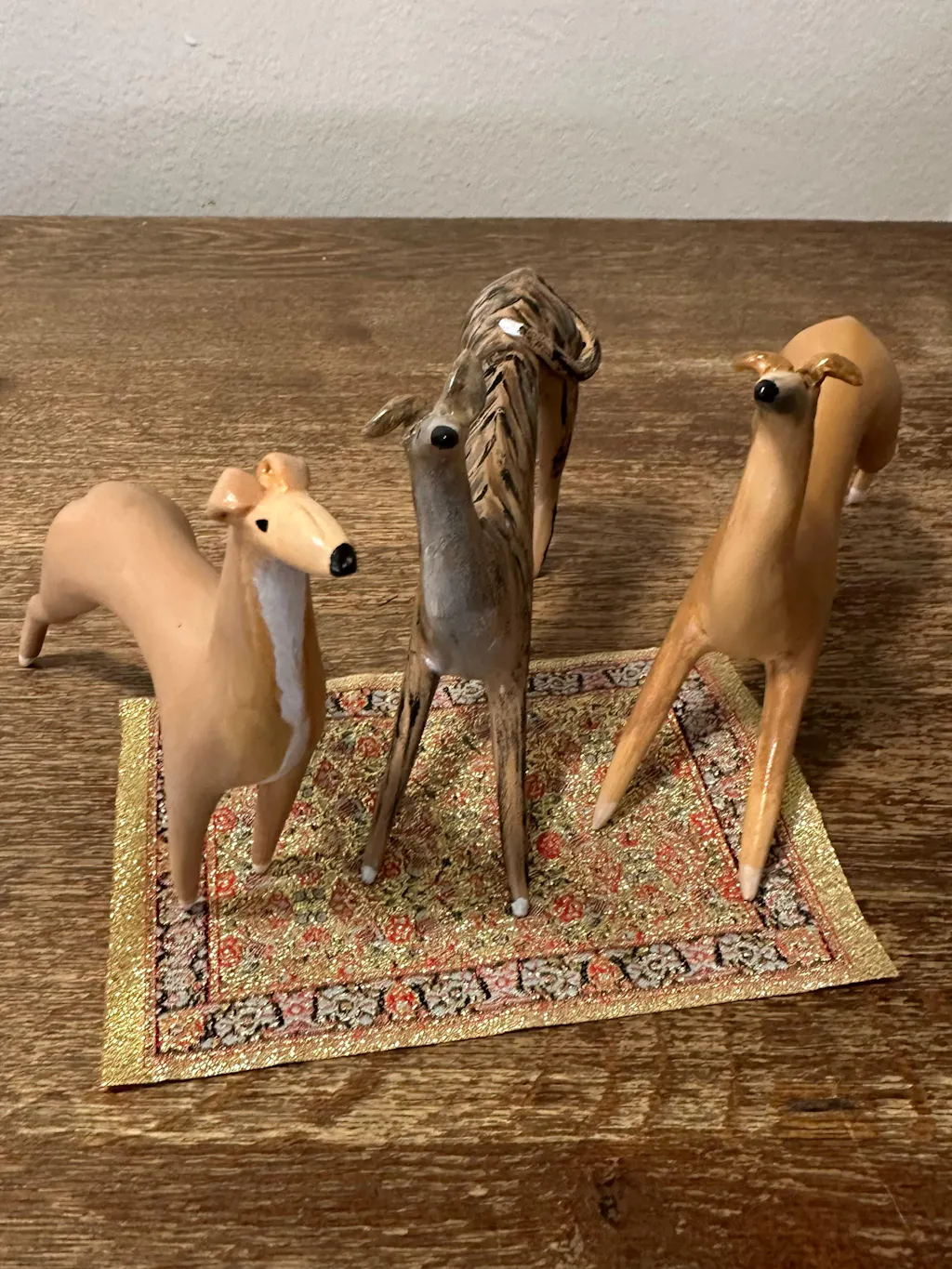 We ordered the three figurines as wedding cake toppers of our galgos, as they themselves couldn't join the festivity. The figurines arrived super well packaged and in time for our wedding. They are absolutely amazing and reflect the character of our dogs so well! Now they have a found a cozy place in our living room. ♥